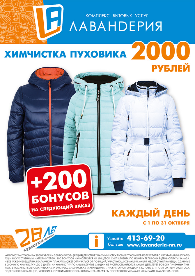 «Химчистка пуховика 2000 рублей + 200 бонусов» (Акция) действует на химчистку любых пуховиков из текстиля с натуральным (пух-перо) и искусственным наполнителем. 200 бонусов начисляются на лицевой счет клиента по номеру телефона в день оплаты заказа. Изображение вещей на рекламном изображении может отличаться от позиций, участвующих в акции. Акция не действует на вещи, сданные в срочную химчистку (до 3 дней). На химчистку по Акции другие скидки не распространяются. Акция действует во всех приемных пунктах, в т.ч. автоматических, и экспресс химчистках «Лавандерия» г. Нижнего Новгорода и г. Кстово с 1 по 31 октября 2025 г. Подробности об Акции, условиях, организаторе ООО «Компания «Марафет» по телефону 413-69-20 и на сайте lavanderia-nn.ru