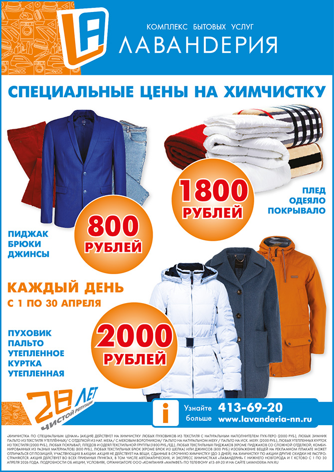 «Химчистка по специальным ценам» (Акция) действует на химчистку любых пуховиков из текстиля с натуральным наполнителем пух-перо (2000 руб.), любых зимних пальто из текстиля: утеплённых/ с отделкой из нат. меха/ с меховым воротником/ пальто на натуральном меху / пальто на иск. меху. (2000 руб.), любых утепленных курток из текстиля (2000 руб.), любых покрывал, пледов и одеял текстильной группы (1800 руб./ед.), любых текстильных пиджаков (кроме пиджаков со сложной отделкой, комбинированных из разных материалов) (800 руб.), любых текстильных брюк (кроме брюк из шелка) или джинсов (800 руб.) Изображение вещей на рекламном макете может отличаться от позиций, участвующих в акции. Акция не действует на вещи, сданные в срочную химчистку (до 3 дней). На химчистку по Акции другие скидки не распространяются. Акция действует во всех приемных пунктах, в т.ч. автоматических, и экспресс химчистках «Лавандерия» г. Нижнего Новгорода и г. Кстово с 1 по 30 апреля 2026 года. Подробности об Акции, условиях, организаторе ООО «Компания «Марафет» по телефону 413-69-20 (код 831) и на сайте lavanderia-nn.ru