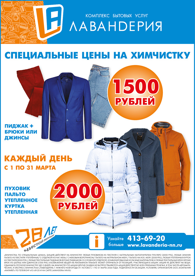 «Химчистка по специальным ценам» (Акция) действует на химчистку любых пуховиков из текстиля с натуральным наполнителем пух-перо (2000 руб.), любых зимних пальто из текстиля: утеплённых/ с отделкой из нат. меха/ с меховым воротником/ пальто на натуральном меху / пальто на иск. меху. (2000 руб.), любых утепленных курток из текстиля (2000 руб.), любых текстильных пиджаков (кроме пиджаков со сложной отделкой, комбинированных из разных материалов) и любых текстильных брюк (кроме брюк из шелка) или джинсов (1500 руб.) Изображение вещей на рекламном плакате может отличаться от позиций, участвующих в акции. Акция не действует на вещи, сданные в срочную химчистку (до 3 дней). На химчистку по Акции другие скидки не распространяются. Акция действует во всех приемных пунктах, в т.ч. автоматических, и экспресс химчистках «Лавандерия» г. Нижнего Новгорода и г. Кстово с 1 по 31 марта 2026 года. Подробности об Акции, условиях, организаторе ООО «Компания «Марафет» по телефону 413-69-20 (код 831) и на сайте lavanderia-nn.ru