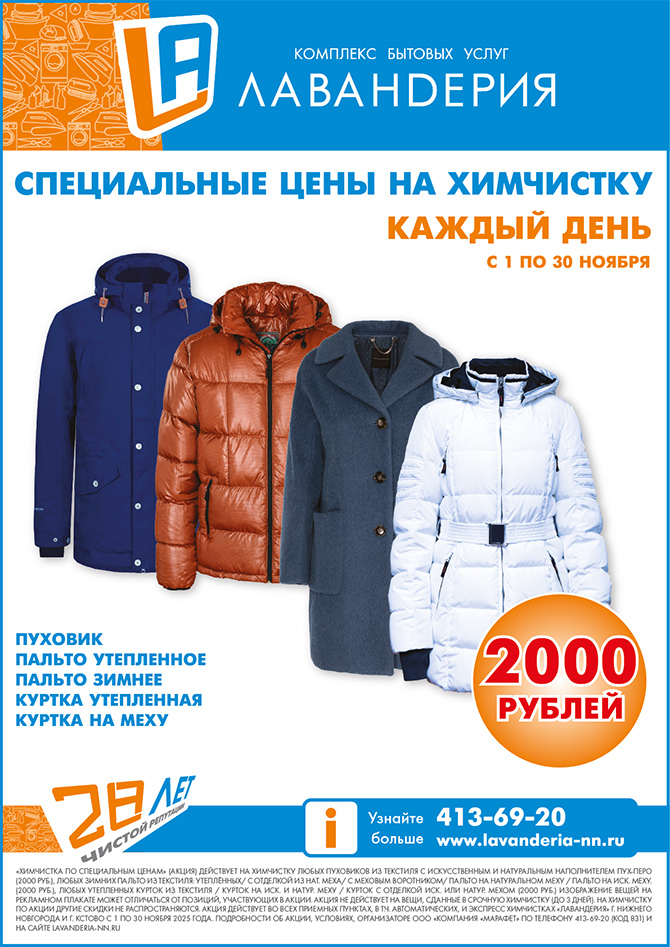 «Химчистка по специальным ценам» (Акция) действует на химчистку любых пуховиков из текстиля с искусственным и натуральным наполнителем пух-перо (2000 руб.), любых зимних пальто из текстиля: утеплённых/ с отделкой из нат. меха/ с меховым воротником/ пальто на натуральном меху / пальто на иск. меху. (2000 руб.), любых утепленных курток из текстиля / курток на иск. и натур. меху / курток с отделкой иск. или натур. мехом (2000 руб.) Изображение вещей на рекламном плакате может отличаться от позиций, участвующих в акции. Акция не действует на вещи, сданные в срочную химчистку (до 3 дней). На химчистку по Акции скидки не распространяются. Акция действует во всех приемных пунктах, в т.ч. автоматических, и экспресс химчистках «Лавандерия» г. Нижнего Новгорода и г. Кстово с 1 по 30 ноября 2025 года. Подробности об Акции, условиях, организаторе ООО «Компания «Марафет» по телефону 413-69-20 (код 831) и на сайте lavanderia-nn.ru